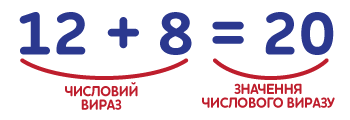 Дорослим варто підказати дитині, що значення числового виразу є числом, яке ми шукаємо. Його записують із іншого боку від знака «дорівнює» в числовій рівності. Тобто все те, що записано до знака рівності, є числовим виразом, а число, записане після знака рівності, є значенням числового виразу. Ці обидві частини виразу рівні між собою.