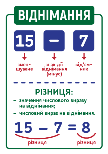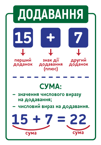 Згодом долучіть завдання із числовими виразами на додавання та віднімання на дві та більше дій.