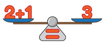 Слід звернути увагу ось на що. Може здатися, що в наведеному прикладі 2 + 3 розглядається як певна проблема, а результат розв’язання цієї проблеми записується по іншу сторону від знака рівності. Але насправді основне призначення знака рівності – показувати, що два значення по обидві сторони від «дорівнює» є рівними між собою. Звідси і його назва. Це як шальки вагів. Ми можемо покласти на одну шальку 1 кг каміння, а на іншу – 1 кг вати. Візуально вони дуже різні, але шальки вагів стоятимуть рівно. Те саме й зі знаком рівності. Яким би чином ми не записували числа чи вирази по обидві сторони від знака рівності, їхнє значення має бути однаковим. Тому в наведеному вище прикладі розмістити знак рівності можна й так: 3 = 2 + 1.