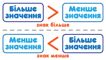 Замість того, щоб писати такі довгі фрази словами – «є більшим, ніж», «є меншим, ніж» – у математиці використовують спеціальні знаки: «більше» (>) та «менше» (<).