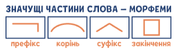 Значущими частинами слова (морфемами) є: корінь, префікс, суфікс, закінчення. При морфемному розборі слова всі частини слова мають графічне позначення.