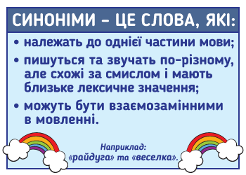 Розповідаємо, що таке синоніми, наводимо правило для учнів 2 (3) класу й приклади синонімів, з'ясовуємо, як пояснити дитині це лексичне поняття