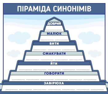 А далі пропонуйте складніші слова – урівноважений, зосереджений. Потім спробуйте дібрати синоніми до іменників та дієслів. Наприклад, запропонуйте дитині дібрати синоніми до слів йти, говорити, смакувати тощо. Ось таке завдання з пірамідою синонімів дитині неодмінно сподобається.