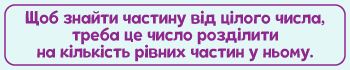 Щоб знайти частину від цілого числа, треба це число розділити на кількість рівних частин у ньому.