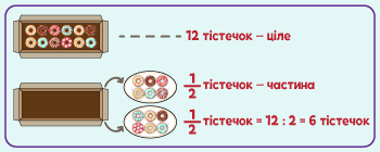 А якщо замість одного яблука взяти коробку тістечок? Як виконати те саме завдання і пригостити двох людей? У коробці 12 тістечок, які мають порівну дістатися обом. Тістечка теж треба розділити на 2. Щоб знайти 1/2 від 12, треба 12 (усю кількість) розділити на 2. Таким чином, кожній людині дістанеться 6 тістечок.