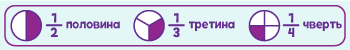 - шукати половину – значить шукати 1/2 частину, тобто одну частину з двох. Відповідно, третина – це значить 1/3, одна частина з трьох, а чверть – 1/4, одна частина з чотирьох.