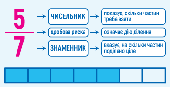 Знаменник у дробі вказує, на скільки частин поділено ціле. Чисельник показує, скільки частин треба взяти. Дробова риска в дробі теж має свою важливу роль. Вона означає дію ділення.