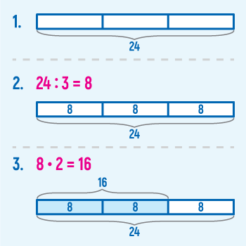 2. 8 • 2 = 16. Тепер відоме значення двох частин із трьох, тобто ми знаємо, скільки буде 2/3 від 24.