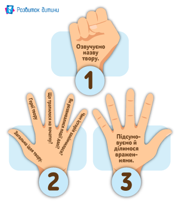 Розбиваємо процес розповіді на п'ять ключових компонентів, кожен із яких відповідає пальцю руки. Цей метод допомагає структурувати текст, систематизувати інформацію, і тому дитині стає легше передати основний зміст прочитаного. Отож, стискаємо руку в кулачок і по черзі відкриваємо пальці.