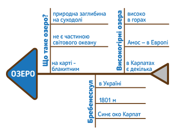 2. Читаємо текст двічі. Усно виділяємо в ньому смислові блоки. У маленьких текстах, які містяться в підручниках молодших класів, смисловими блоками, як правило, є абзаци. У більших текстах – розділи. Отож, щоб позначити 3 абзаци, малюємо на скелеті риби 3 рисочки, спрямовані в різні боки.