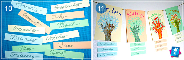 Просимо дитину підписати назву кожної пори року, або робимо це самостійно. Пояснюємо, в якому порядку відбувається чергування сезонів. Якщо дитина вже достатньо доросла, щоб вчити послідовність місяців, зробіть для неї картки і разом розташуйте їх у правильному порядку.