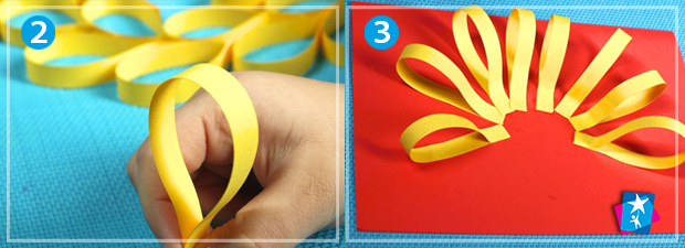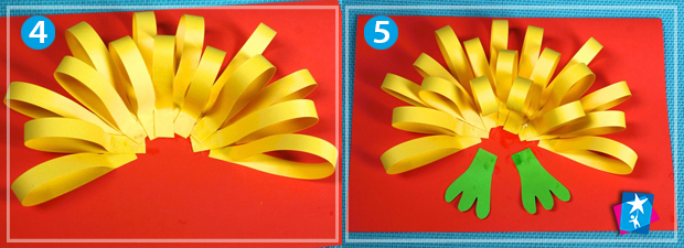 Зігніть кінчики паперових відрізків у петлю та склейте кінці між собою. Потім візьміть фонову основу для аплікації та приклейте перший шар "хвоста" півколом. Друге півколо охоплюватиме менший діаметр та перекриватиме пусті ділянки першого шару. Після цього виріжте та приклейте лапки посередині знизу композиції, але не торкаючись краю листа.