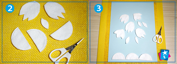 Підбираємо фон блакитного кольору. Вирізаємо з ватних дисків силуети, що нагадують квіти пролісків.