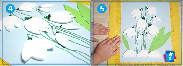 Наклеюємо на фон квіти в красивій розкладці, а також з половинок ватних дисків викладаємо сніг в нижній частині роботи. Домальовуємо зеленим маркером або фломастером стеблини рослин, наклеюємо паперове листя у формі, типовій для пролісків.