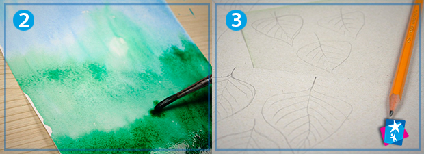 Вкладаємо аркуш акварельного паперу вертикально. Змочуємо пензлик у воді та наносимо рідину по всьому формату, можна в два прийоми. Поки папір вологий, додаємо фарби — зверху наносимо блакитний фон, який поступово переходить у зелень. Відкладаємо до повного висихання.