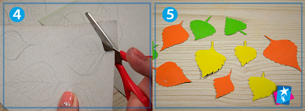 Поки фонова основа сохне, малюємо на звороті кольорового картону кілька листочків у осінній гаммі. По формі ці листки мають нагадувати березові. Після вирізання по загальних нарисах ви можете прорізати загострені краї у листя "зубчиками".