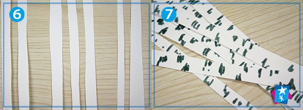 Візьміть другий акварельний аркуш. Наріжте його смужками по всій довжині листа. Смужки повинні трохи відрізнятися по ширині. Це будуть березові стовбури. Розфарбуйте їх відповідно до природних кольорів берези — з чорними рисками і плямами по білій поверхні.