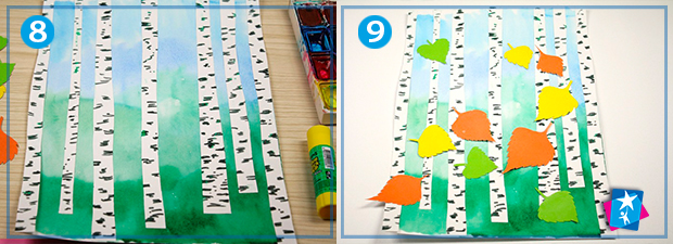 Далі попрацюйте з розкладкою елементів на повністю висушеному акварельному фоні. Секрет перспективи заключається в тому, що більш широкі стовбури мають вийти на передній план, а тонкі розташовані позаду і вище. Після того, як розкладка вам сподобається, приклейте дерева на аплікацію. Осінні кольорові листочки стануть яскравим акцентом на першому плані. Розкладіть їх, як вам подобається. Для більш динамічної композиції можете уявити, як розлітається і крутиться купа листя на вітрі.