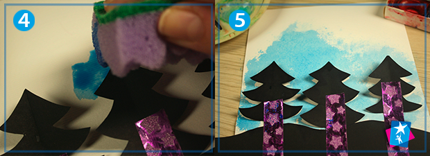 Тепер підготуємо фарбу. Крапнемо пензликом трохи води у палітру. Додамо синього кольору, розмішуємо, доки не вийде небесний відтінок. За допомогою поролонової губки вбираємо фарбу з палітри та переносимо на фон. Просто рівномірно вбиваємо губкою фарбу у папір та картон. В кінці етапу знімаємо маски — залишиться небесно-блакитний фон з білими ялинками та хвилеподібною лінією горизонту.