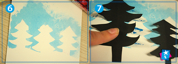 Тепер вирізаємо з картону наші основні об’єкти — пару крупних ялинок. Ними будемо робити відбитки таким чином, щоб стовбур дерев знаходився нижче лінії горизонту. Густо нанесемо фарбу на картонні ялини та притиснемо пальцями до фону у потрібних місцях. Знімаємо штампи, дофарбовуємо пензликом певні частини, яких вам не вистачає.