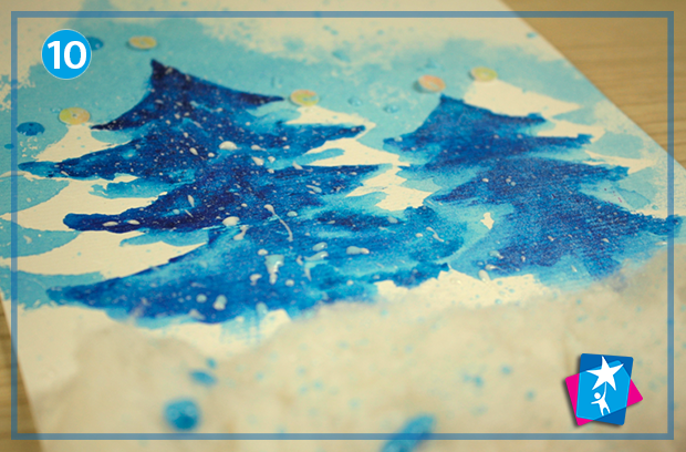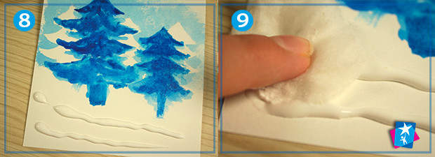 На передньому плані на клей ПВА саджаємо ватяні кульки. Верхівки ялинок прикрашаємо пайєтками. Розбризкуємо білу зубну пасту на розфарбовані сині ділянки роботи. Під час другого підходу в пасту додаємо трохи блакитної акварелі та розбризкуємо щіткою на білі частини композиції.