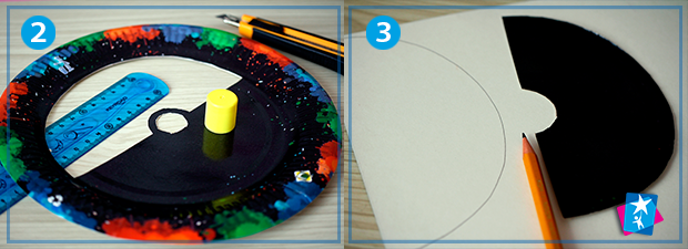 Візьміть першу паперову тарілку. Проведіть олівцем під лінійку горизонтальну лінію посередині. В самому центрі обведіть вашу кришечку, домалюйте такий же контур, але більший, на відстані приблизно пів сантиметра від першого кола.