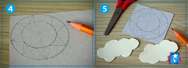 Далі створіть сонце на жовтому картоні: обведіть на звороті два круглі предмети різного діаметру або скористуйтеся циркулем. Відстань від меншого до більшого кола заповніть промінцями. З картону виріжте хмаринки – пару світлих і одну темну.