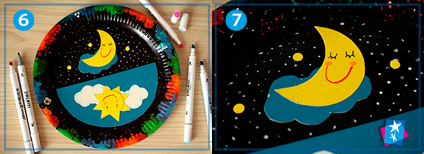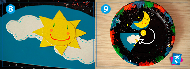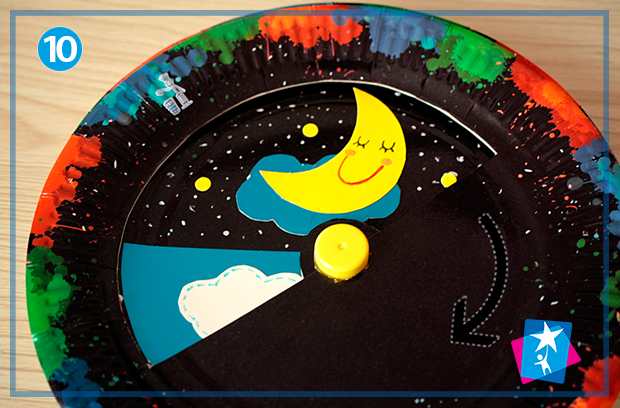 Тепер викладіть аплікацію на основі (ціла тарілка): з одного боку темний фон, місяць і зірочки, а з іншого – блакитне небо, хмарки і сонечко. Виріжте по центру отвір по розміру кришечки. Накладіть зверху тарілку з вирізаним віконечком, поєднайте їх разом за допомогою кришечки. І покрутіть верхній шар – у віконечко проглядатиме то нічна, то денна частина вашої аплікації.