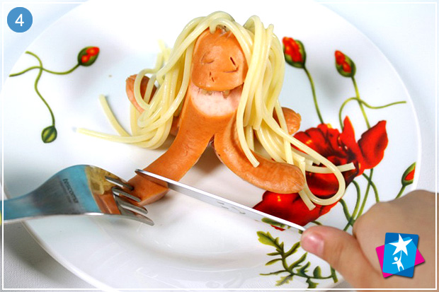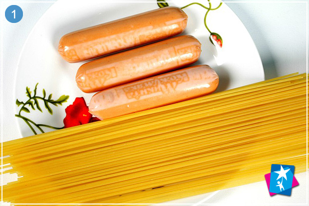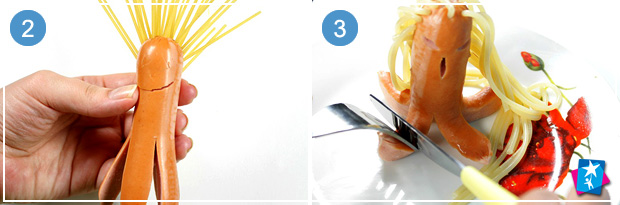 Знизу і до середини надріжте кожну сосиску на чотири частини — це будуть лапки "восьминога". Зверху встроміть спагеті у твердому вигляді. Покладіть в окріп, потримайте до готовності обох інгредієнтів. Обережно дістаньте страву двома вилками, викладіть на тарілку і дайте малюку спробувати.
