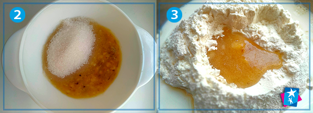 Розтовчіть банан до консистенції каші, розмішайте з цукром. Викладіть цю масу в борошно і додайте молоко. Вимісіть виделкою або міксером якомога краще. Далі розлийте по формах і поставте в духовку на 60 хвилин мінімум та випікайте за температури 180⁰С. Тривалість випікання залежить від матеріалу форм, тому періодично перевіряйте стан готовності випічки. Паска буде готовою тоді, коли ви встромите в неї зубочистку та витягнете без слідів сирого тіста.
