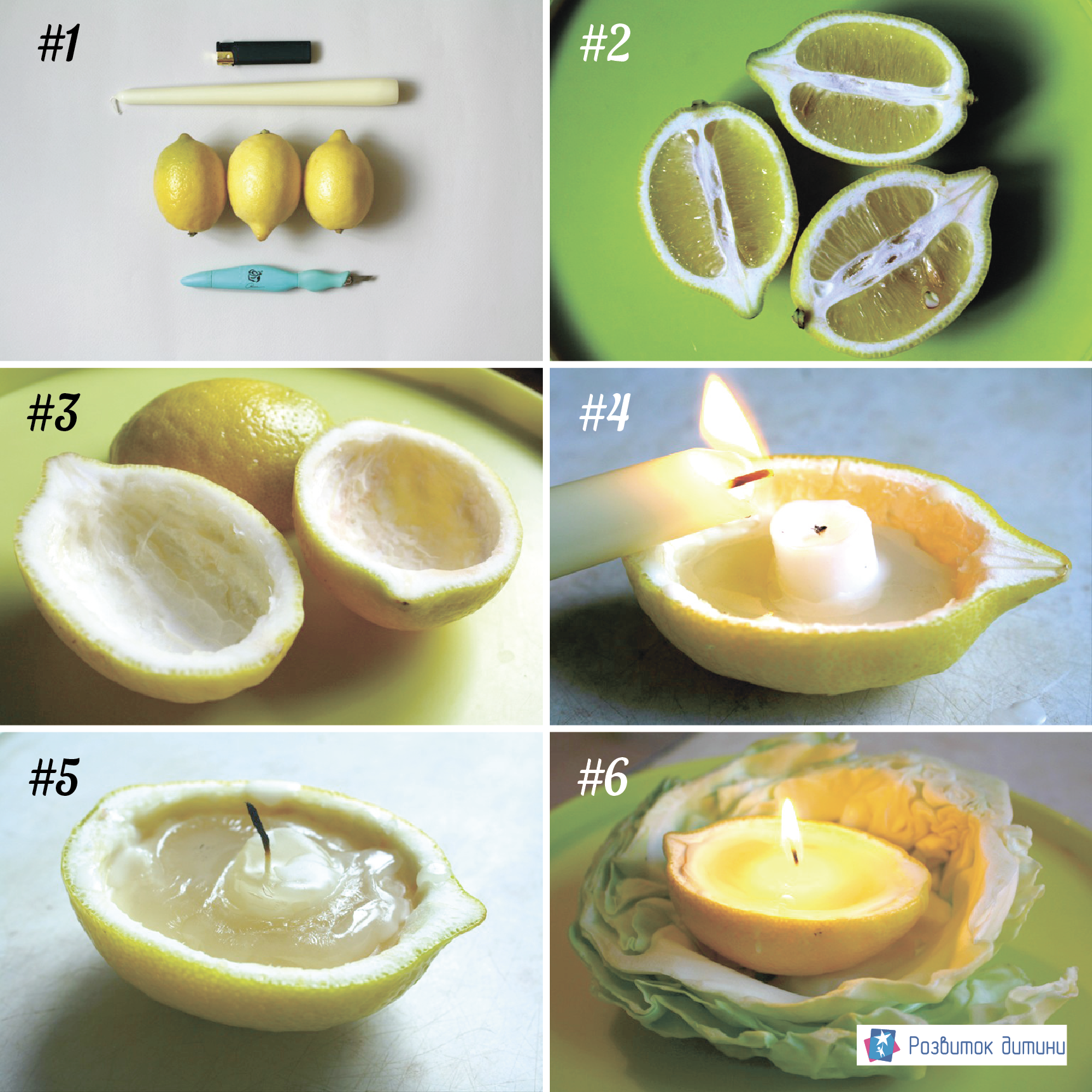 Відрізаємо маленьку частину свічки, висота відрізу повинна співпадати з глибиною лимонного «човника». Звільняємо фітіль на відрізі та починаємо розтоплювати віск великої свічі, накрапуючи всередину лимонної шкірки. Щоб прискорити процес, розплавте з дитиною кілька свічок. Заповнюйте до того рівня, поки не будете задоволені результатом.