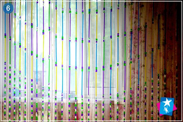 Прикріпіть новостворені ниткові штори на дверний прохід, вікно або над верхнім шаром на тюлі. Пластикові трубочки абсолютно не чіпляються одна до одної, тому дитина зможе гратися з елементами й перебирати їх, скільки захоче.