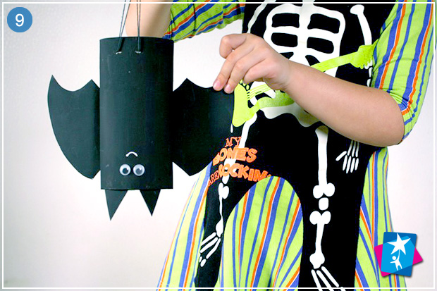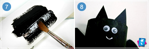 Намалюйте, виріжте і приклейте вуха. Пофарбуйте летючу мишу у чорний колір. Прикріпіть накладні очі та намалюйте милу посмішку.