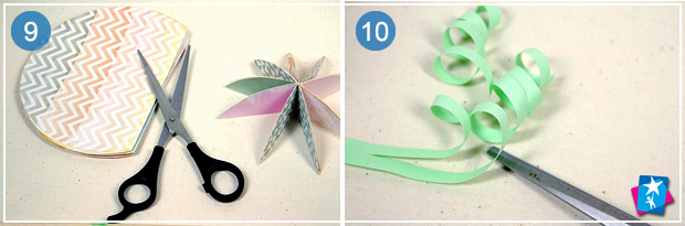 Візьміть зелені смужки паперу (в ідеалі з набору для квілінгу). Проведіть лезом ножиць по смужці декілька разів, щоб отримати закручені спіралі. Прикладіть ці "кучері" до гарбуза, зверху зімітуйте стеблину. Ось і все — ваші оригінальні декорації готові, дайте малюку завдання розставити їх на місця. Гарного святкування!