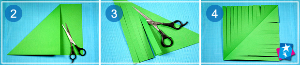 Складіть аркуш таким чином, щоб утворився квадрат, зігнутий по діагоналі; решту паперу відріжте. На складеному квадраті потрібно зробити надрізи ножицями. Згин не чіпаємо, надрізи будуть розміщуватись від країв і не доходити до центру квадрата, якщо його розгорнути.