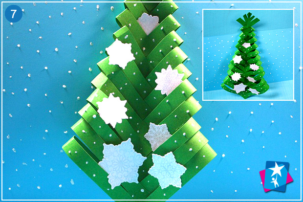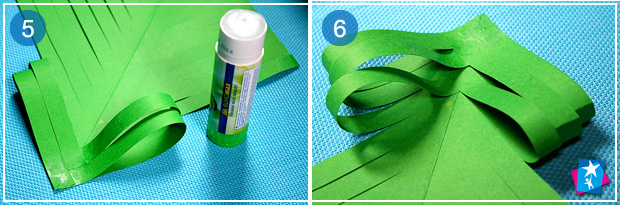 Беремо клей і змащуємо край "бахроми" справа. Підтягуємо її в центр квадрата. Так само робимо і з відрізом з іншого боку. Почергово, то справа, то зліва складаємо з відрізів нашу ялинку. Чим тонший аркуш паперу, тим простіше це робити — "гілочки" будуть мати плавний вигин, а не перелом. Процес створення об'ємної ялинки з паперу дещо подібний до заплетення коси. Гарно притискаємо клей після кожного рядочка, підклеюємо одразу, якщо клеєвий шар не витримує. Зверху святкової ялинки залишаємо шматок паперу і вирізаємо зірку.