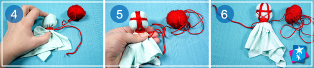 Наступним кроком буде створення хреста на обличчі. Автентичний сакральний хрест робиться таким чином, щоб накладені одна на одну нитки утворювали в центрі контрастний квадрат. Але адаптуємо цей етап для дитячої творчості. Починаючи від шиї намотаємо вертикальну лінію з нитки на ліву частину голови ляльки, наприклад, 7 мотків за годинниковою стрілкою. Потім виводимо нитку справа від шиї і піднімаємося вгору, знову намотуючи 7 вертикальних витків, цього разу з правого боку відносно тіла ляльки. А далі приступаємо до намотування горизонтальної лінії, яка має проходити приблизно посередині обличчя. Якщо подивитись на голову ляльки зі звороту, перехрещені нитки нагадають зірку. Декілька разів обгорнемо шию ниткою, і можна вважати етап виконаним.
