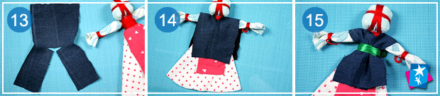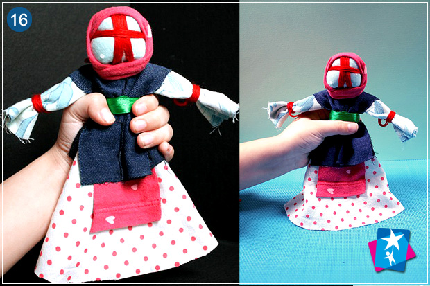 Щоб зробити корсетку, рекомендуємо взяти невеликий прямокутний відріз цупкої тканини, та розрізати вздовж до центру, а потім посередині трохи надрізати перпендикулярно. В цей розріз має поміститися шия ляльки. Одягаємо корсетку і за допомогою стрічки робимо пояс на талії. Пов'язуємо голову хусткою.