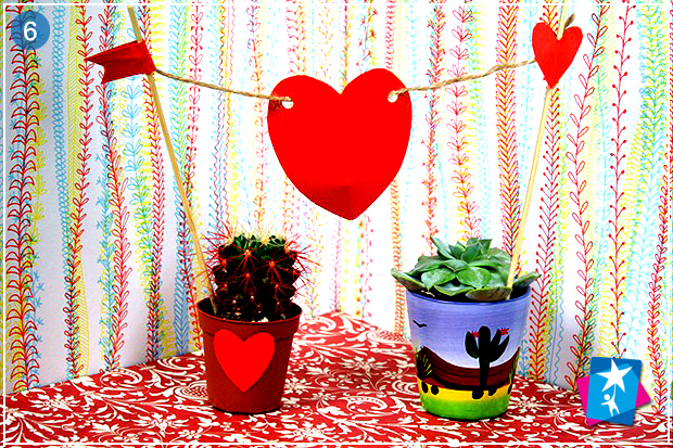 Коли ви заберете прищіпку, то помітите симпатичне пухке серденько, його треба продірявити та нанизати на мотузку. Кінці мотузки прив’яжіть до тонких довгих шпажок із дерева або пластмаси. Вузли можна сховати за паперовими прапорцями або маленькими сердечками. Довжину мотузки ви продумаєте заздалегідь: наприклад, щоб поєднати два маленьких горщики, вистачить 10 — 15 см, для прикрашання одного видовженого горщика може знадобитись і 30 — 50 см нитки (стрічки, мотузки), а також ціла гірлянда із сердечок.