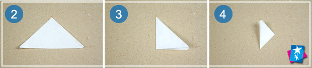 Робимо першу квітку. Перетворюємо квадрат на трикутник, згинаючи його по діагоналі. Перегинаємо трикутник по висоті у правий бік. Нижній правий кут зменшеного трикутника підтягуємо до верху і пригладжуємо лінію згину. Проводимо уявну медіану з нижнього кута до середини протилежної сторони і згинаємо трикутник по цій лінії.