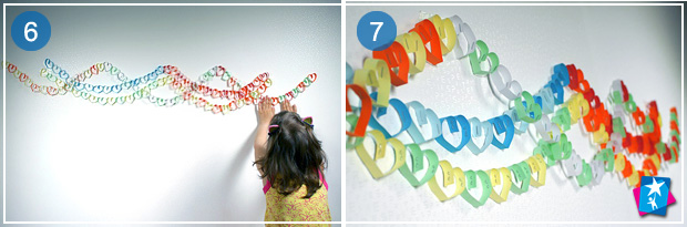 Коли збереться багато сердечок, скріпіть їх між собою у гірлянду. За допомогою двостороннього скотчу приєднайте гірлянди до стіни. Все — можна кликати маму, щоб привітати зі святом.