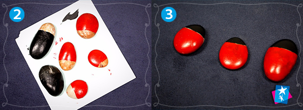 Висушіть округлі симетричні камінці, які подібні по формі до тіла комах. На три чверті вкрийте кожен камінець червоною фарбою, залиште рівний контур. Після підсихання нанесіть чорну фарбу там, де має бути голова сонечка, розмітьте вертикальною полосою крила, поставте чорні цятки.