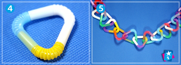 Візьміть набір пластикових трубочок для коктейлів. Відріжте ту частину, що згинається: з запасом приблизно по 5 — 7 міліметрів з кожного боку навколо "гармошки". Три відрізаних елементи поєднайте у одну трикутну ланку ланцюга. Щоб створення ланки проходило легко, манікюрними ножицями зробіть надрізи на тих ділянках, що будуть вставлятися всередину трубочки.