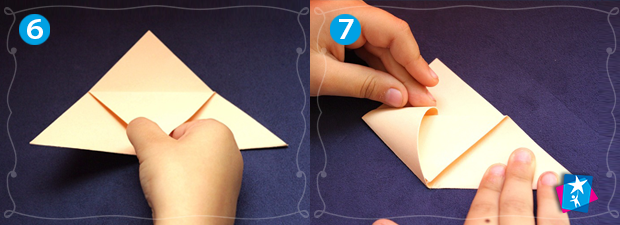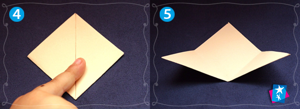 Покладіть паперовий квадратик на кут, щоб він став ромбом. Зігніть по горизонтальній лінії, щоб отримати рівнобедрений трикутник, що лежить на основі. Підтягніть лівий кут до вершини, повторіть те ж саме з правим кутом. Добре притисніть всі лінії.