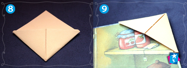 Ми отримали кишеньку, в яку необхідно обережно закласти нижні кути, до упору. Таким чином ми отримуємо менший, міцніший ромб з параметрами 5х5 см. У нього можна вкладати сторінки книжки, і він дуже зручний у якості книжкової закладки.