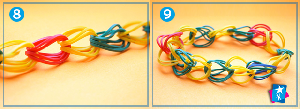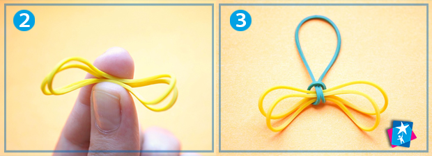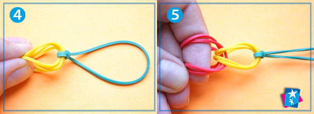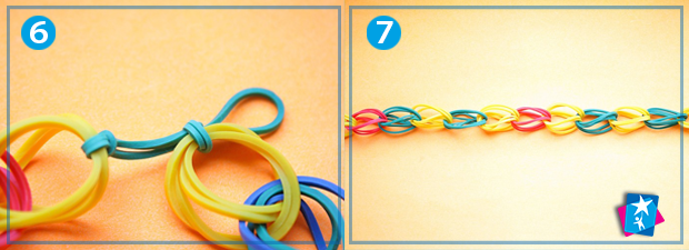 Кінці першого елемента складіть разом: у вас вийде чотири петельки, через які слід протягти наступний елемент (пару складених разом резинок іншого кольору). Подовжуйте таким чином ваш виріб на ту довжину, що вам потрібна.
