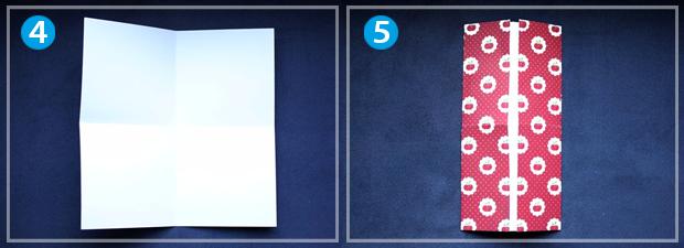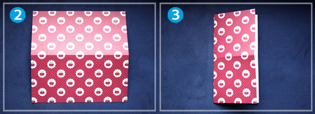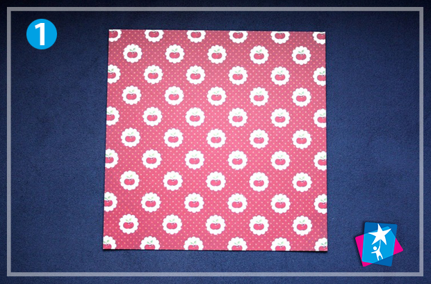 1. Складіть квадратний аркуш паперу посередині: в горизонтальному і вертикальному напрямку. Назовні має бути лицьова сторона паперу — той колір, який ви обрали для сукні.