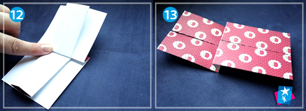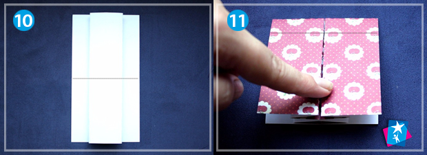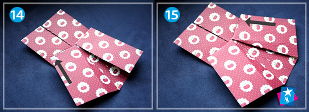 7. Перегортаємо орігамі, щоб працювати з внутрішньою стороною. Зверху середня частина виступає — беремо за кутики середньої частини і опускаємо вниз; в центрі вони сходяться. Пригладжуємо лінії згину. Знову підіймаємо ці кутики на місце і формуємо пальцями ромб по щойно отриманих лініях згину. Притискаємо.