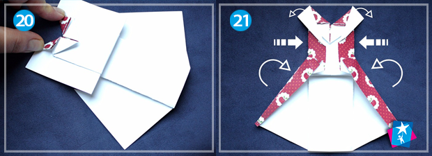 9. Формуємо остаточну форму нашого плаття. Починаємо з зовнішніх боків: загинаємо їх у напрямку центру, при цьому краї спіднички підтягуються і ми їх охайно складаємо і пригладжуємо нові згини. Розгортаємо "комірець", формуючи прямі верхні кути.