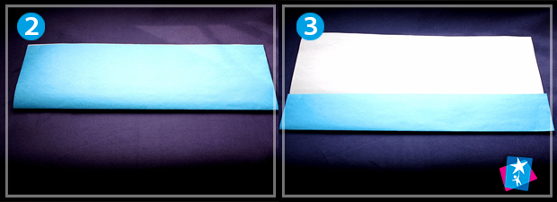 1. Вкладаємо аркуш формату А4 горизонтально. По центру проводимо уявну горизонтальну лінію та складаємо по ній папір. Міцно притискаємо лінію згину. Лицьова сторона зверху.